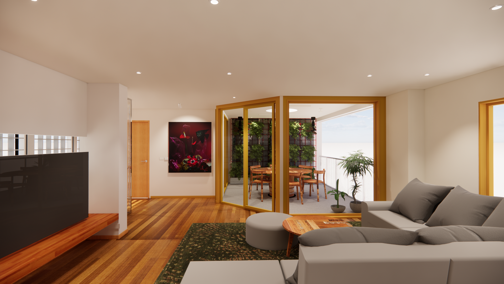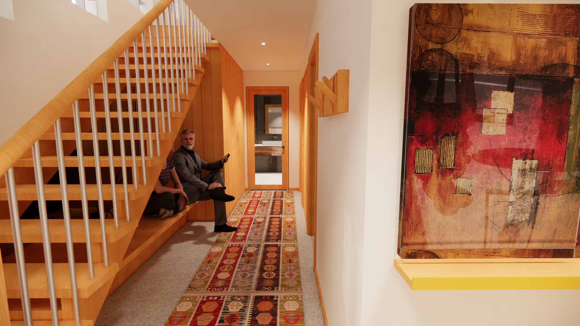 The entry unfolds into a hallway that seamlessly links the spaces, leading to a sunlit zone with integrated storage, thoughtfully designed to maintain clarity and flow.