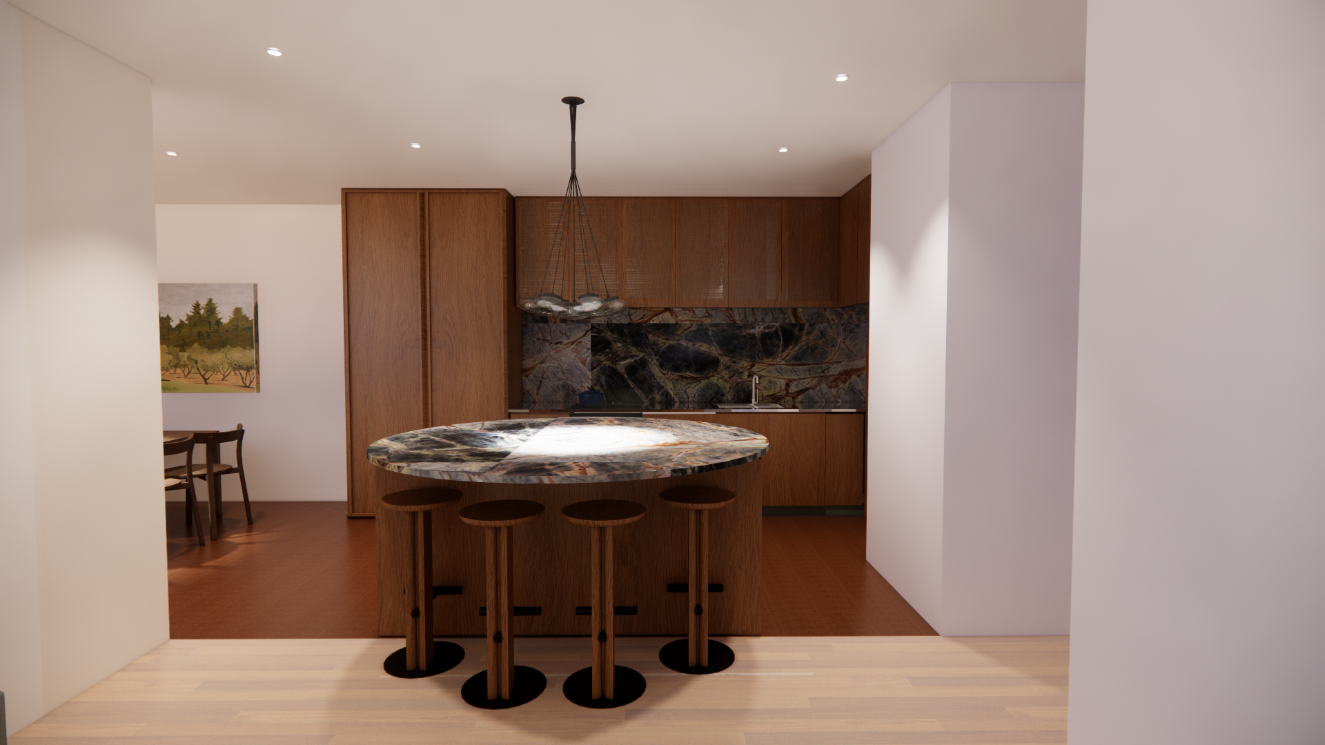 Timber and stone converge in a dynamic interplay of shapes to form the kitchen, which remains distinct yet creates an open connection to the living and dining zones.