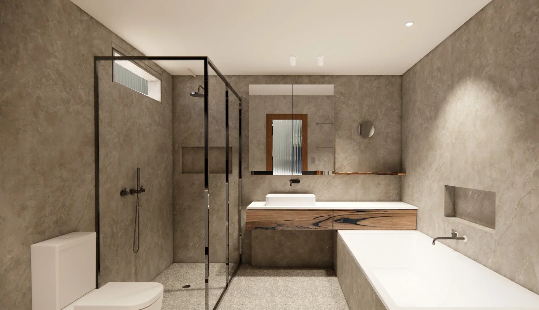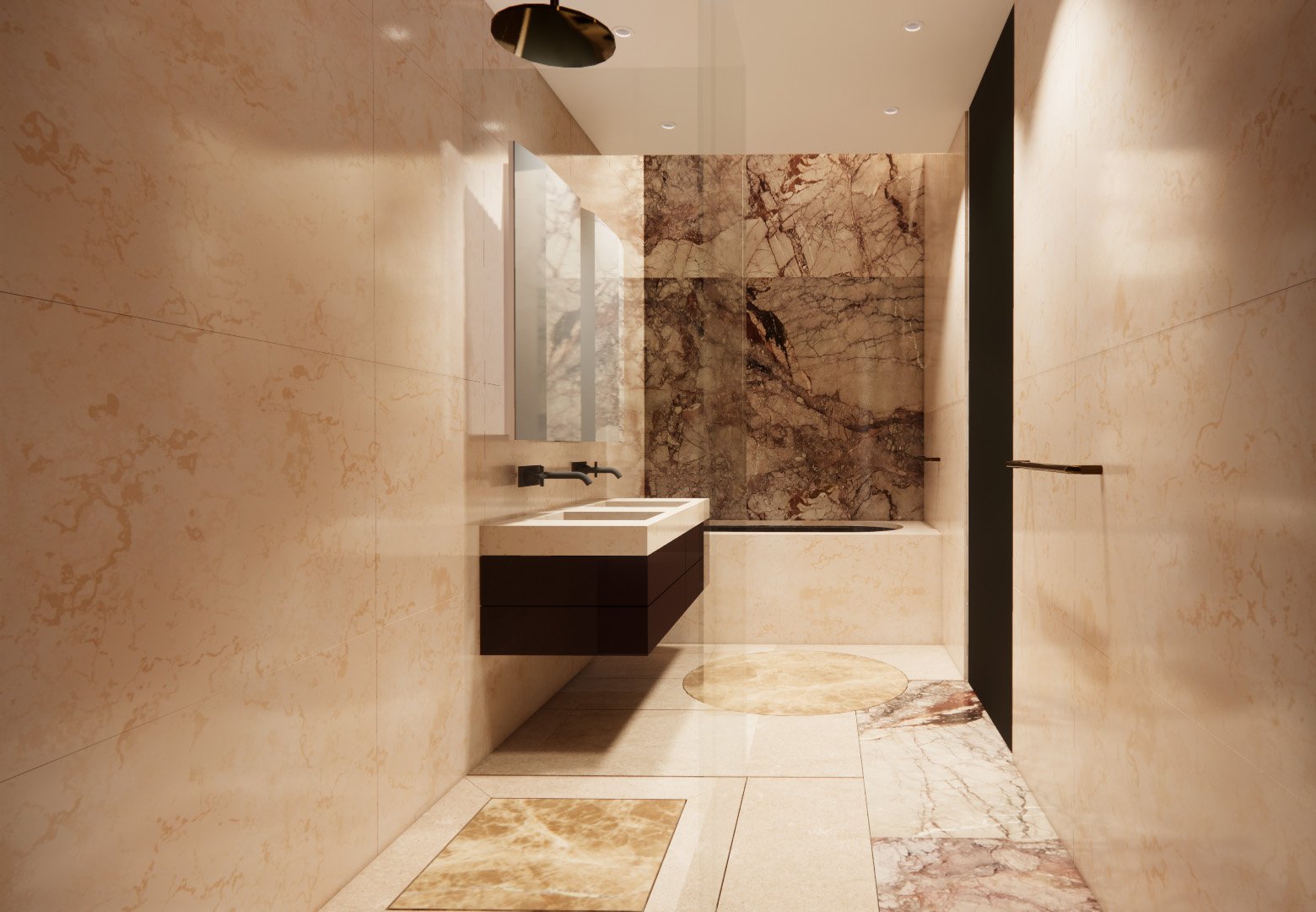 A homage to Asia, the bathroom is conceived as an intimate oasis—where serene materials and mindful design invite deep relaxation.